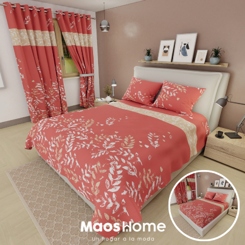 Combo sabana cortina cama doble 140mtr Fucsia Hojas